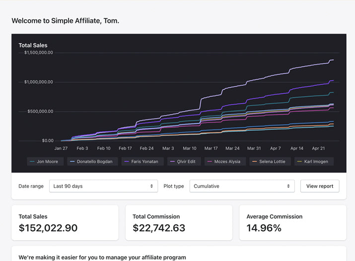 The affiliate management dashboard exists within your store admin, and it is where you will track your sales & commissions, add / edit affiliates, and manage payouts.